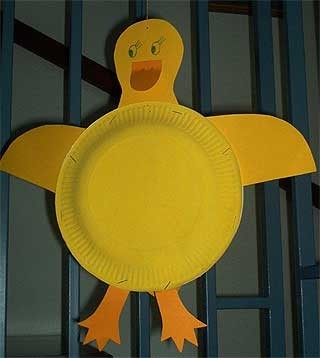 Bemalt die Pappteller mit gelber Farbe. Während des Trocknens könnt ihr schon die Flügel, die Füße, den Schnabel und den Kopf auf gelbem und orangem Tonpapier aufmalen. Nun die ausgeschnittenen Körperteile auf den Pappteller kleben oder festtackern. Schön sieht es auch noch aus, wenn zusätzlich noch Federn aufgeklebt werden. |