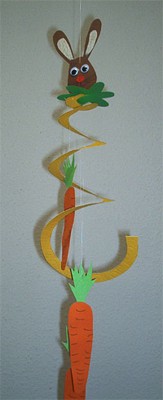 Die Schablonen auf das Papier übertragen und ausschneiden. Dann die Möhren, den Hasen zusammenkleben und an die Spirale kleben bzw. binden. Bei mir hängen sie in der Küche und drehen lustig vor sich hin … Aus der Spirale kann man auch Schlangen für Karneval machen; die Kinder brauchen sie nur bunt zu bemalen und eine spitze Zunge daran kleben.